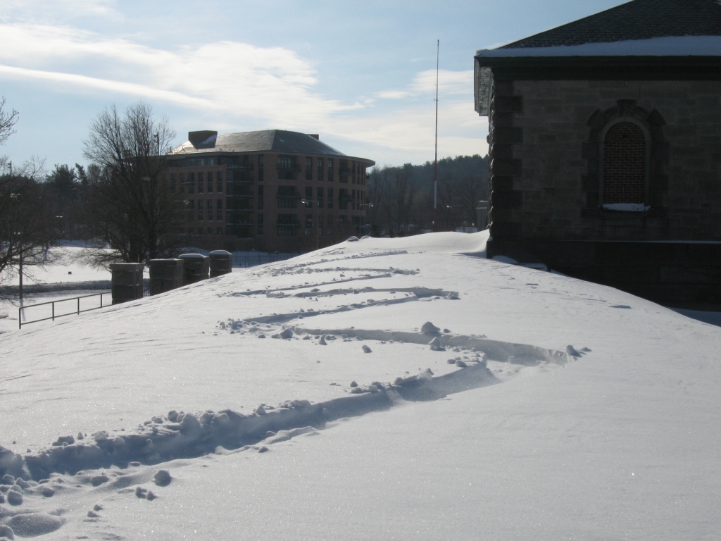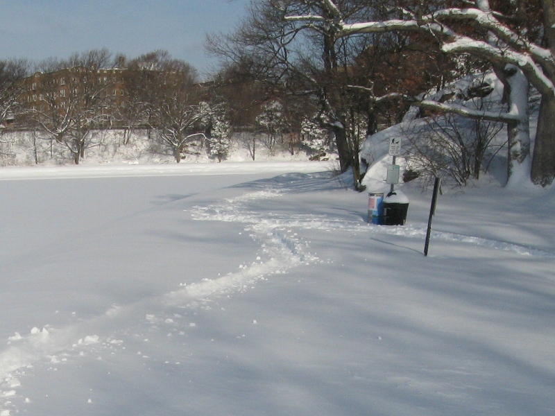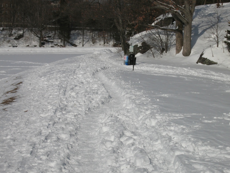 There is this reservoir near me which people walk around - even in the winter. After some time has passed since a large snowstorm, worn paths tend to form.