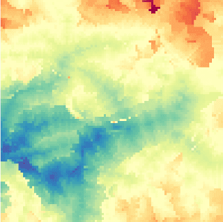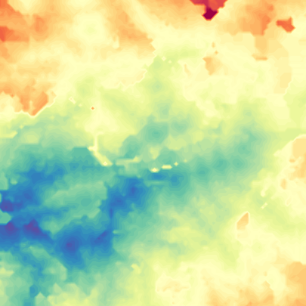 contourf(img,linspace(0,100,250),'linestyle','none');Now you end up with something pretty like this which you can overlay on to a nice map.
