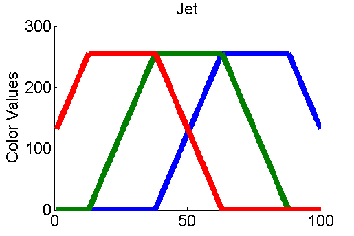 The graph on the right uses a colormap from http://colorbrewer2.org/. Using this colormap no particular color stands out colorblind people can get more information out of the graph too. I used the 'spectral' option set to 11 colors, and interpolated in between. Comparing the color value changes of the default (jet) and 'spectral' colormaps you can see immediately that a whole lot more thought went into the colorbrewer colormap.